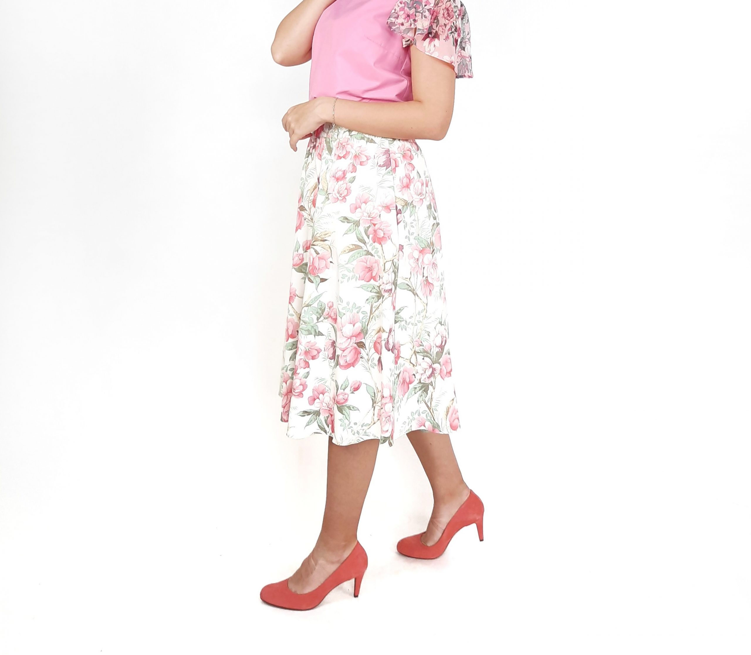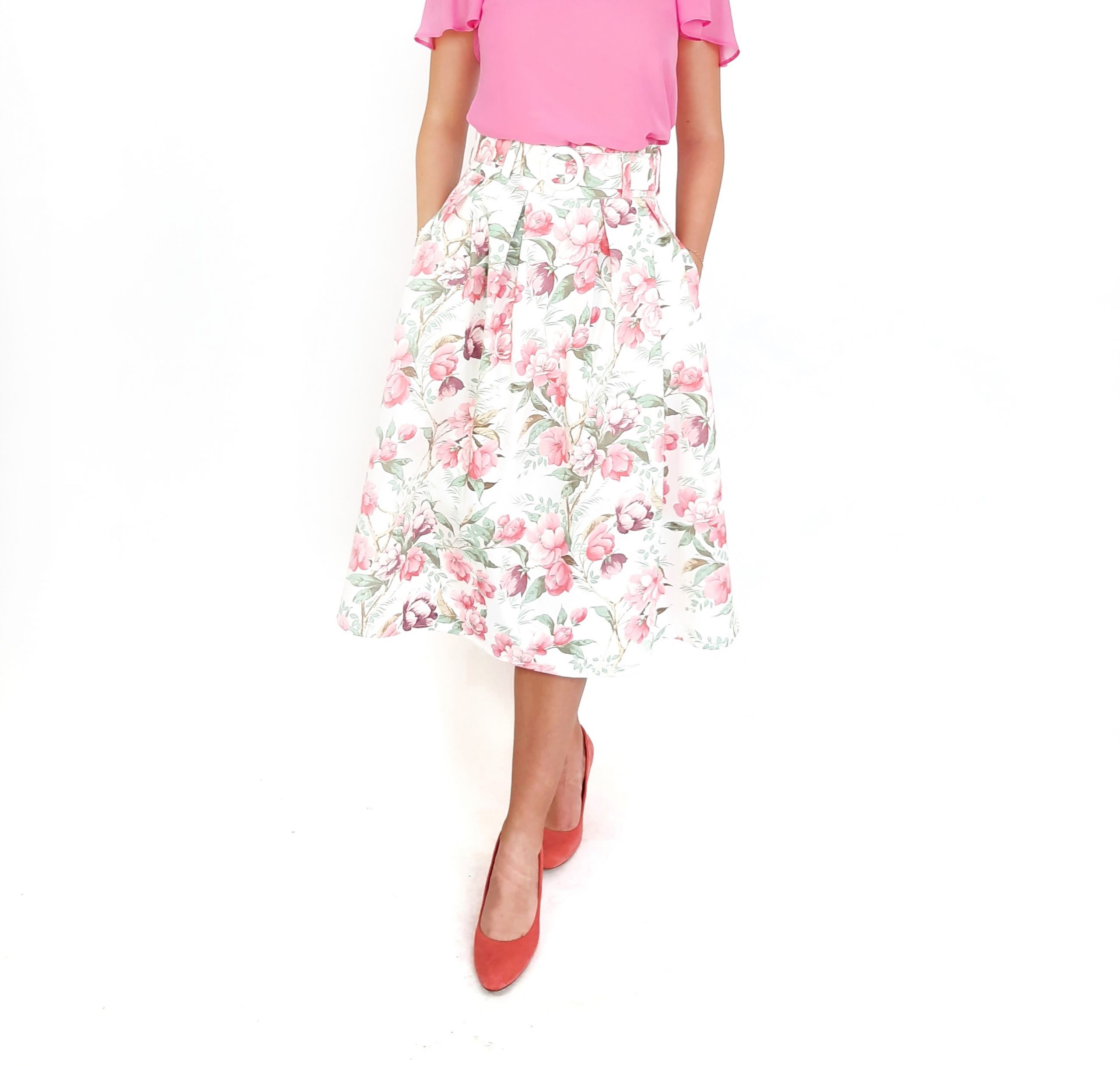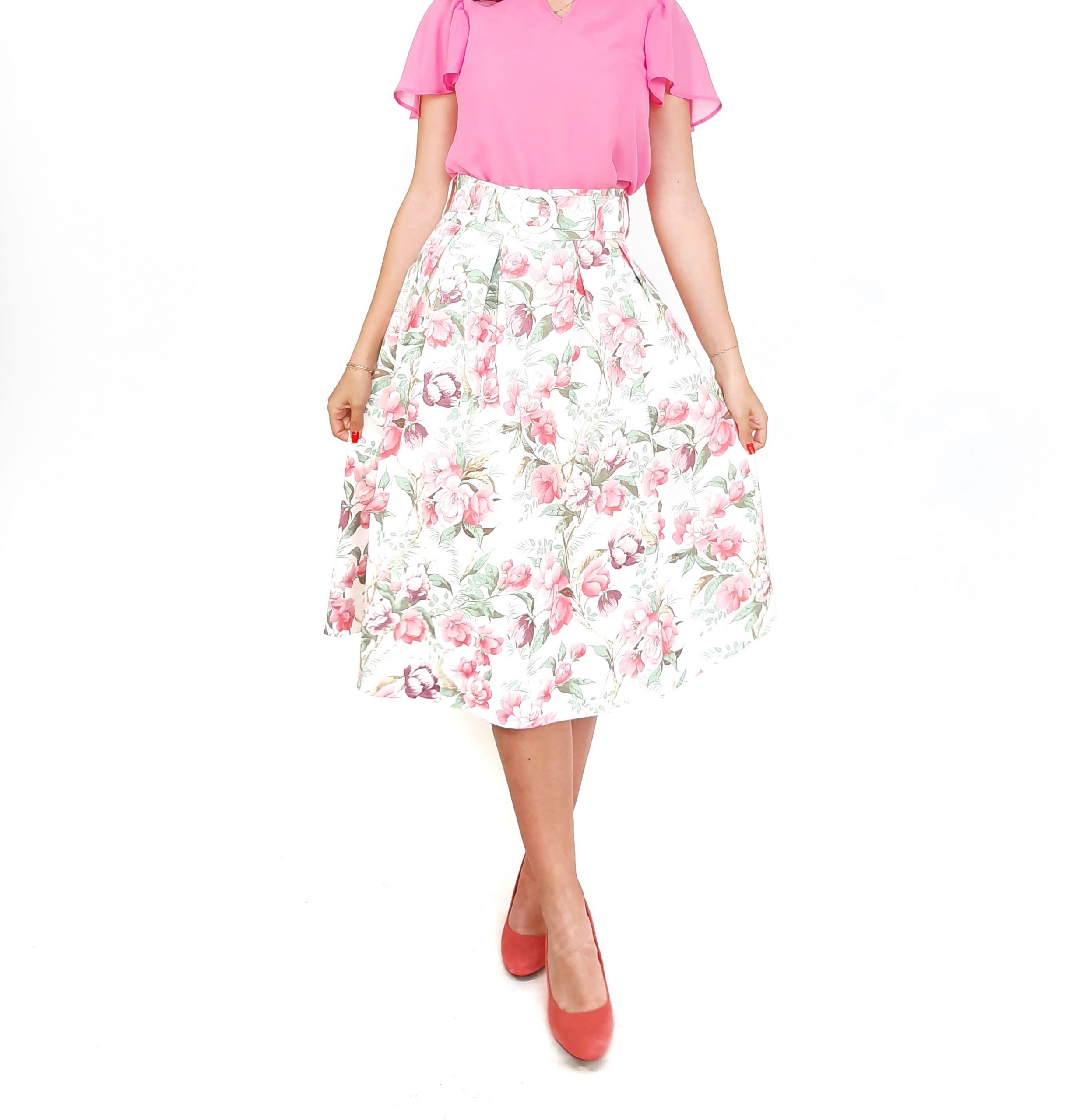 Fusta alba cu imprimeu flori roz.